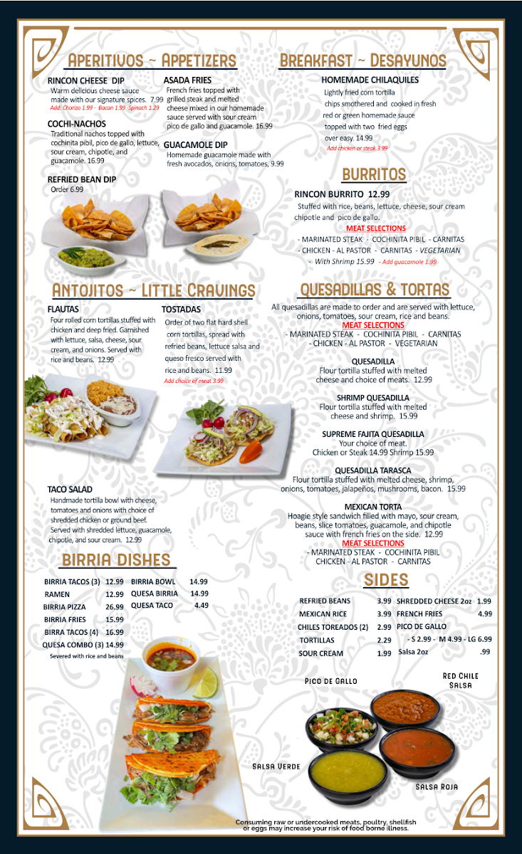 Side dishes are also available, including Pico De Gallo, French Fries, and Sour Cream, giving diners the perfect complements to their main dishes. The Street Tacos are another standout, offering options like Asada (Marinated Steak), Camaron (Shrimp), and Cochinita Pibil (Seasoned Pork), all served in soft corn tortillas. If you’re craving a filling burrito, the Rincon Burrito is a must-try.