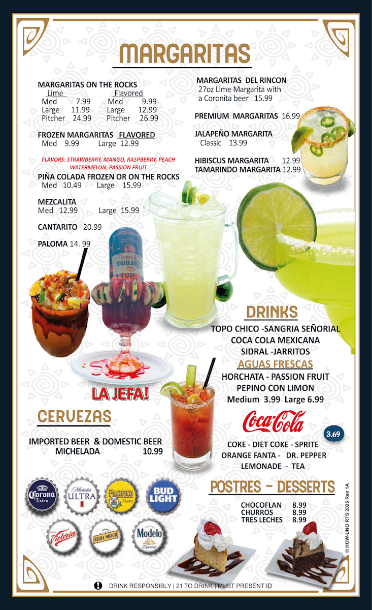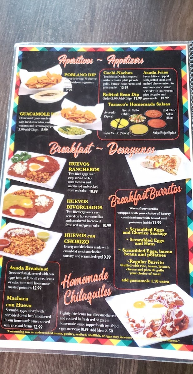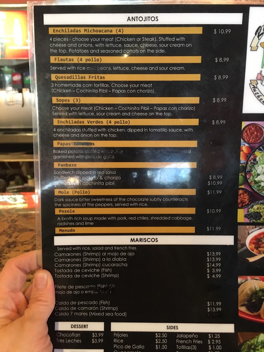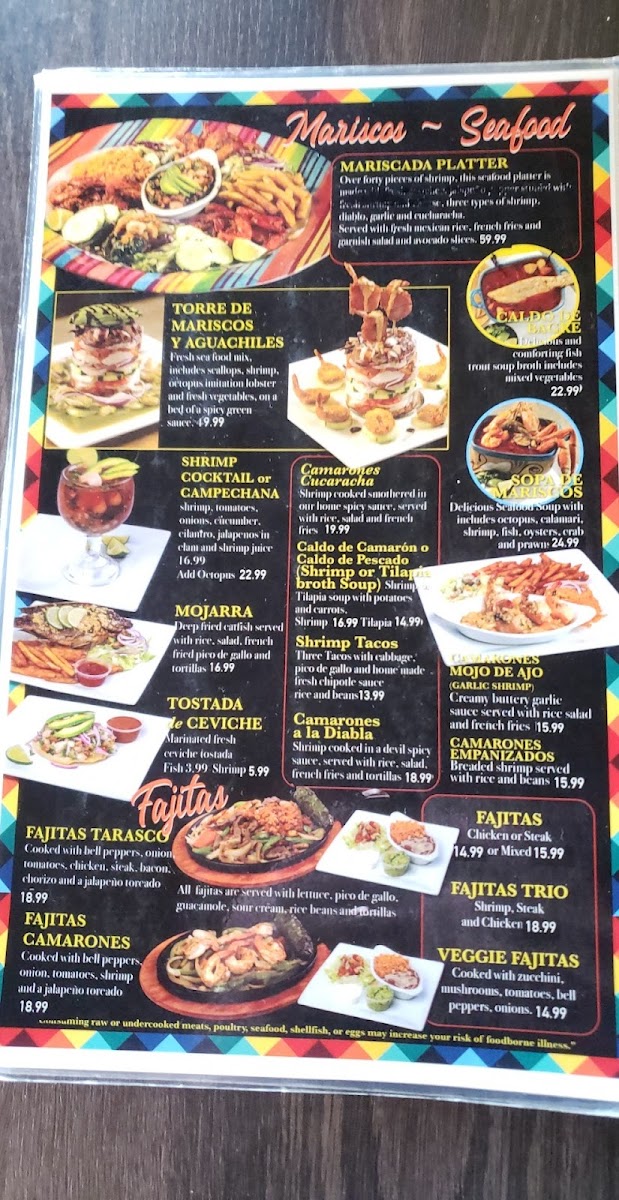 The Antojitos (little cravings) section offers delicious snacks, such as Tostadas, Hard Shell Tacos, and the flavorful Shrimp Chimichanga. For a more substantial meal, the Mariscos (seafood) section includes delectable dishes like La Regia and Snack Cockroach Shrimp, while the Fajitas menu offers sizzling options like the Fajitas Tarasco, Fajitas Trio, and Molcajete Tilin.