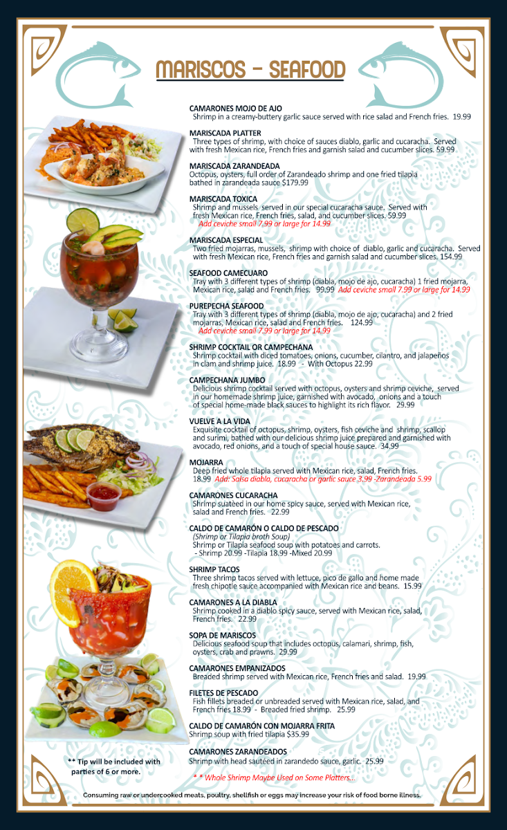 Shrimp and mussels served in our special cucaracha sauce. Served with fresh Mexican rice, French fries, salad, and cucumber slices. Add ceviche small or large for an additional charge.