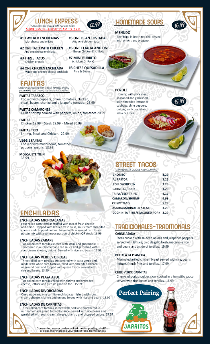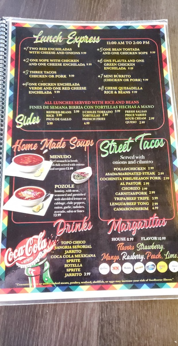 For lovers of Enchiladas, the restaurant offers a wide variety including Enchiladas Verdes O Rojas, Enchiladas De Carnitas, and Enchiladas Divorciadas, ensuring a choice for every palate. If you're in the mood for a hearty bowl, try their Homemade Soups like Menudo or Pozole, both offering a comforting and filling option. When it comes to drinks, they offer refreshing options like Coca-Cola Mexicana 1/2 Litro and classic Coca-Cola.